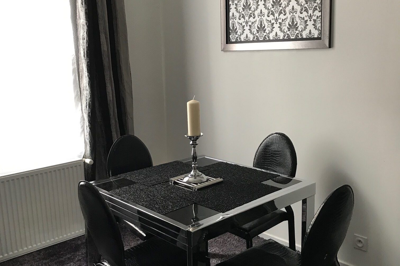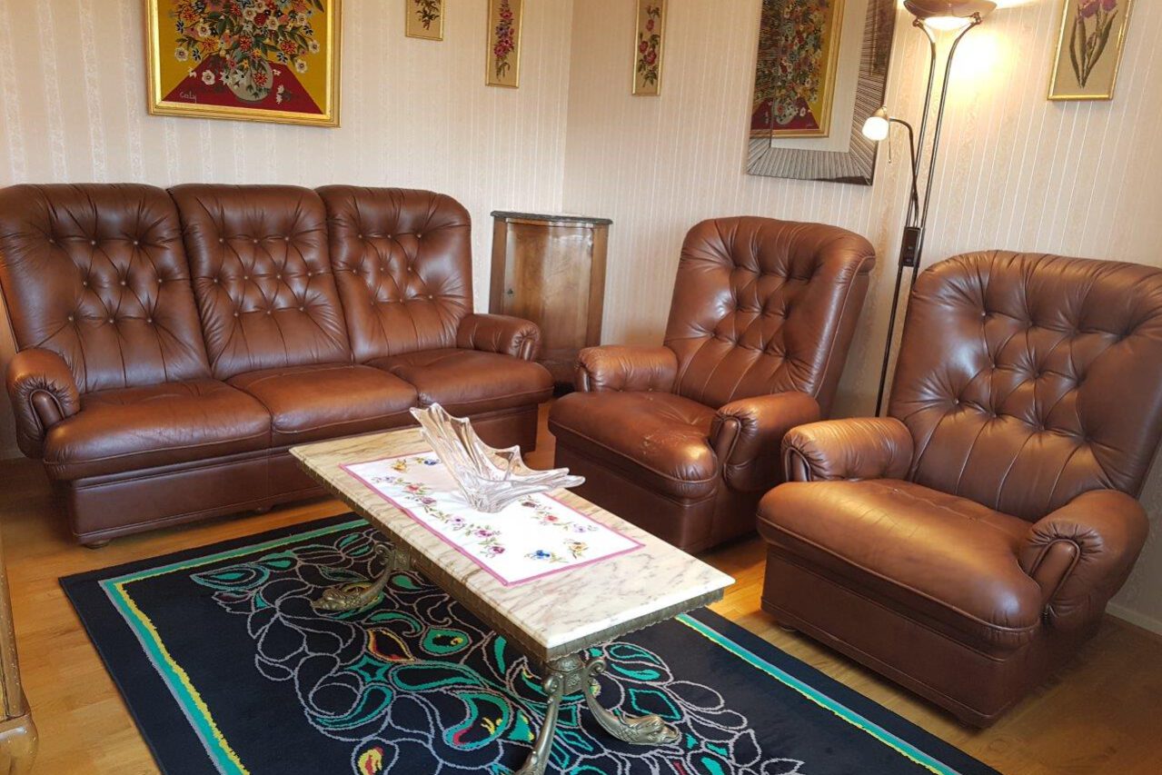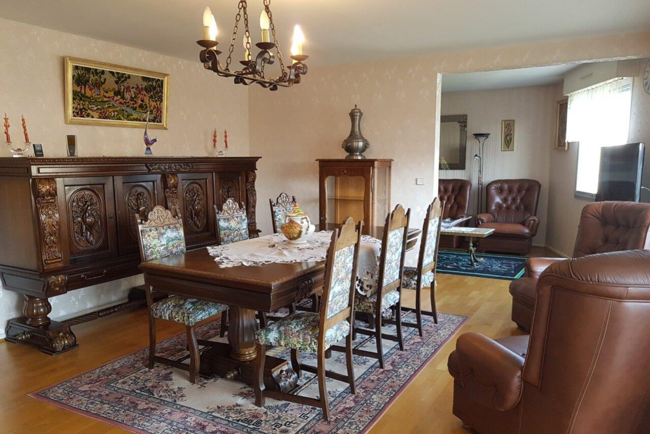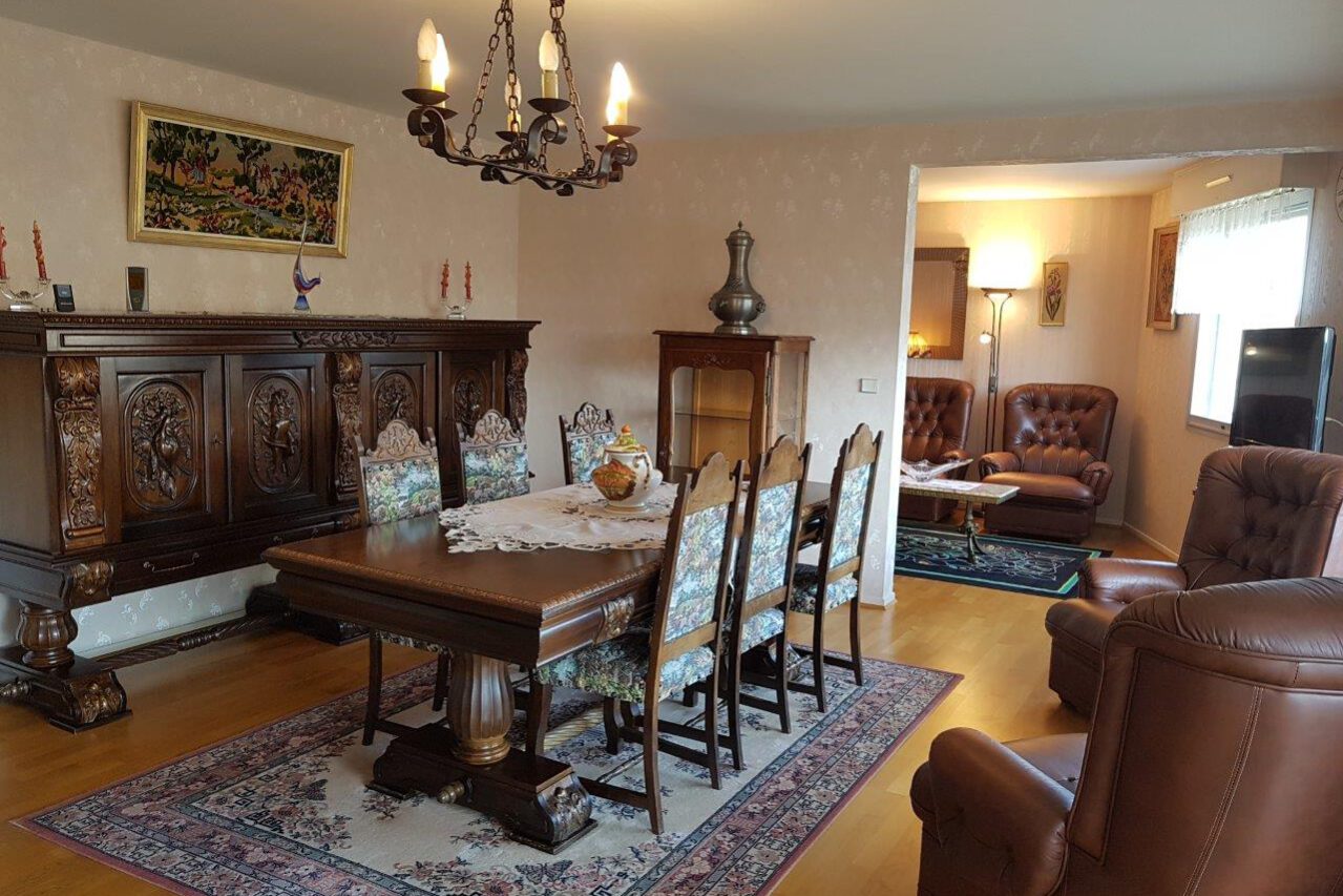 - D’une grande salle à manger, avec table et chaises, buffets, fauteuils en cuir, grande télé.